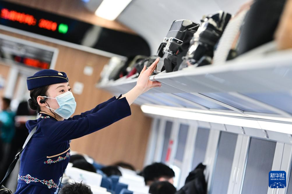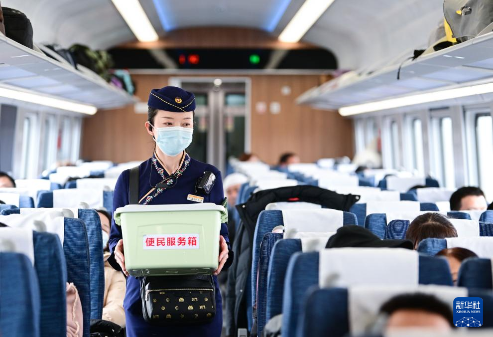 1月30日,中國(guó)鐵路青藏集團(tuán)有限公司西寧客運(yùn)段動(dòng)車(chē)隊(duì)乘務(wù)員王璐在為旅客服務(wù)。新華社記者 張龍 攝