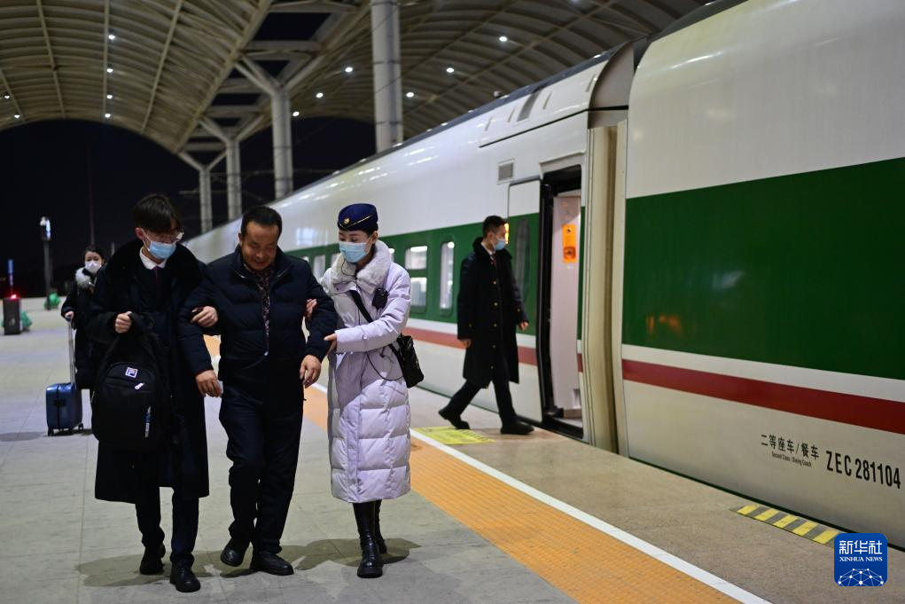 1月30日,中國(guó)鐵路青藏集團(tuán)有限公司西寧客運(yùn)段動(dòng)車(chē)隊(duì)西格八組乘務(wù)員陳麗琴在協(xié)助重點(diǎn)旅客下車(chē)。新華社記者 張龍 攝