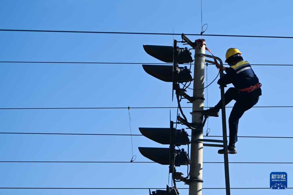 1月29日,格爾木電務(wù)段格爾木東信號車間察爾汗信號工區(qū)職工何江東在高柱信號機(jī)上檢查信號機(jī)安裝螺絲是否緊固。新華社記者 張龍 攝