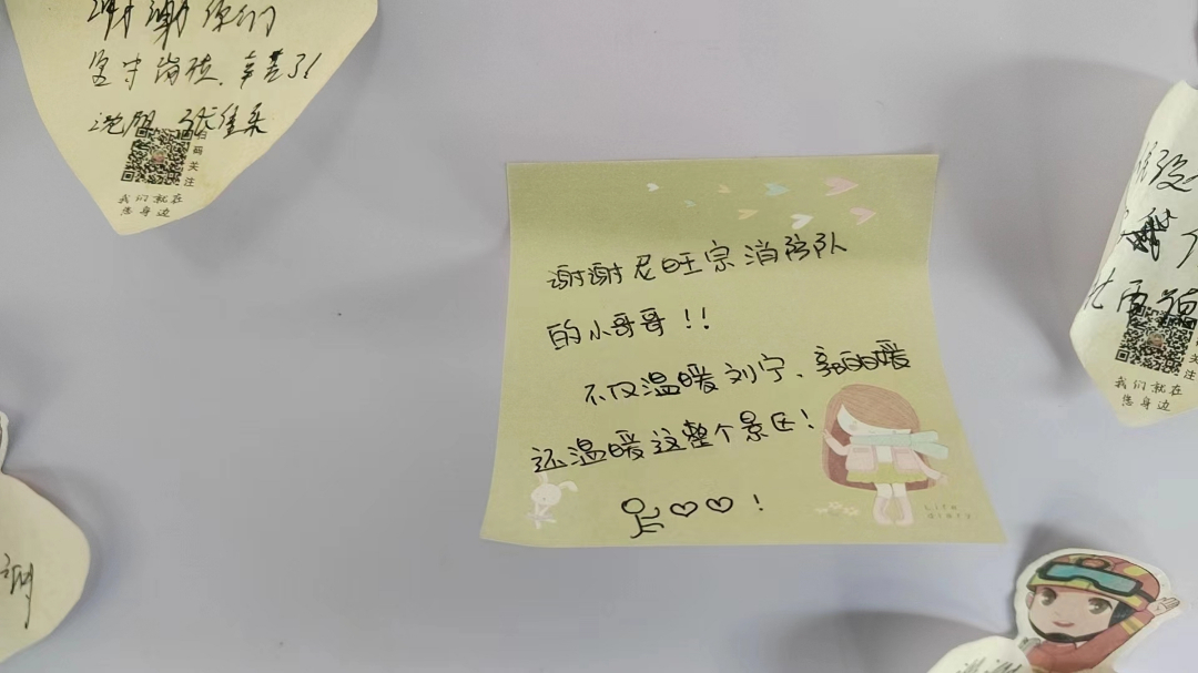 隊員們細致暖心的幫助與關懷,讓兩位遠方的朋友萬分感激,并主動在“藍焰貼心服務留言墻”留下了他們最簡單最純真最溫暖的話語:“謝謝尼旺宗消防隊的小哥哥,不僅溫暖劉寧、郭麗媛,還溫暖這整個景區(qū)!”