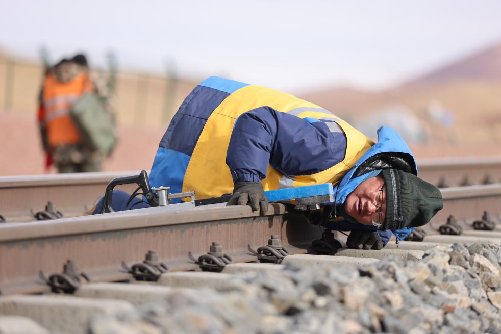 張福強趴在鐵軌上檢查線路情況。(中國鐵路青藏集團有限公司格爾木工務段提供)