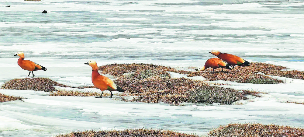 3月8日,青海省玉樹藏族自治州隆寶灘國際重要濕地迎來春天首批赤麻鴨12只,身披赤黃褐色的“彩衣”赤麻鴨,或游走在草灘上棲息覓食,或展翅翱翔天空,或在冰面上歇息,讓隆寶灘國際重要濕地在春季充滿了勃勃生機(jī)。