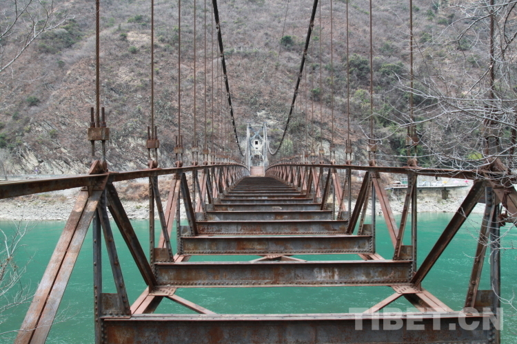 該橋始建于1950年11月。當(dāng)時(shí)為了徹底解放西藏、鞏固西南邊防,中國(guó)人民解放軍第十八軍在劉伯承、鄧小平、賀龍等同志“一面進(jìn)軍,一面建設(shè)”的號(hào)召下,在修筑川藏公路的同時(shí),由西南交通部負(fù)責(zé),廣大解放軍指戰(zhàn)員、全體技術(shù)人員和各路民工發(fā)揚(yáng)不怕?tīng)奚母锩?,克服一切困難,修建了川藏公路上的第一座鋼索懸橋,于1951年5月底勝利完成了建橋任務(wù)。