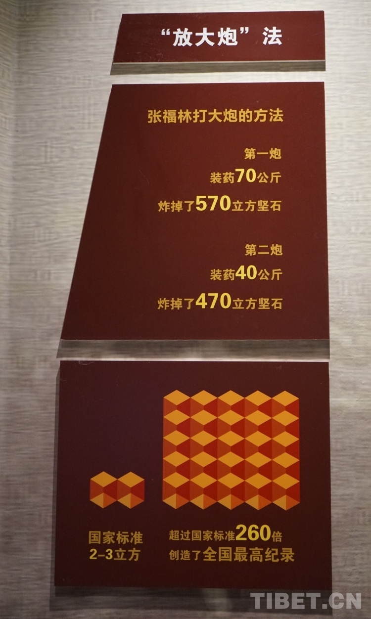 在雀兒山修路時(shí),張福林白天與戰(zhàn)友們懸在巖壁上打炮眼,晚上到工地上研究堅(jiān)石、孤石、松石、片石等各種石頭的打眼、裝藥、放炮等技術(shù),并積極向工程人員、技工同志、工兵部隊(duì)學(xué)習(xí),最終提出了改進(jìn)裝藥的方法,即“放大炮法”?!胺糯笈诜ā钡谋乒πС瑖覙?biāo)準(zhǔn)260倍,創(chuàng)造了全國爆破的最高紀(jì)錄。這一方法不僅能提高工效,還能節(jié)約炸藥,在筑路部隊(duì)中得到全線推廣,張福林也被大家譽(yù)為“大炮手”。