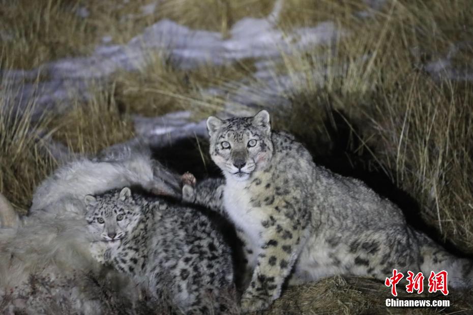 青海天峻3只雪豹“大快朵頤”