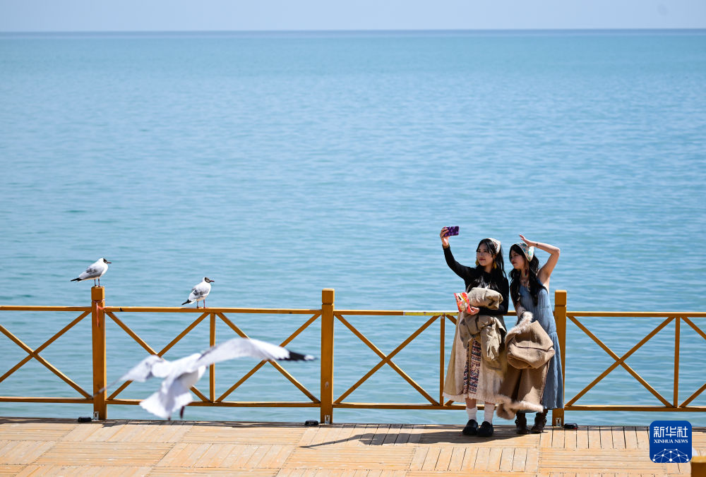 4月11日,游客在青海湖畔的東格爾觀魚臺拍照。新華社記者 張龍 攝