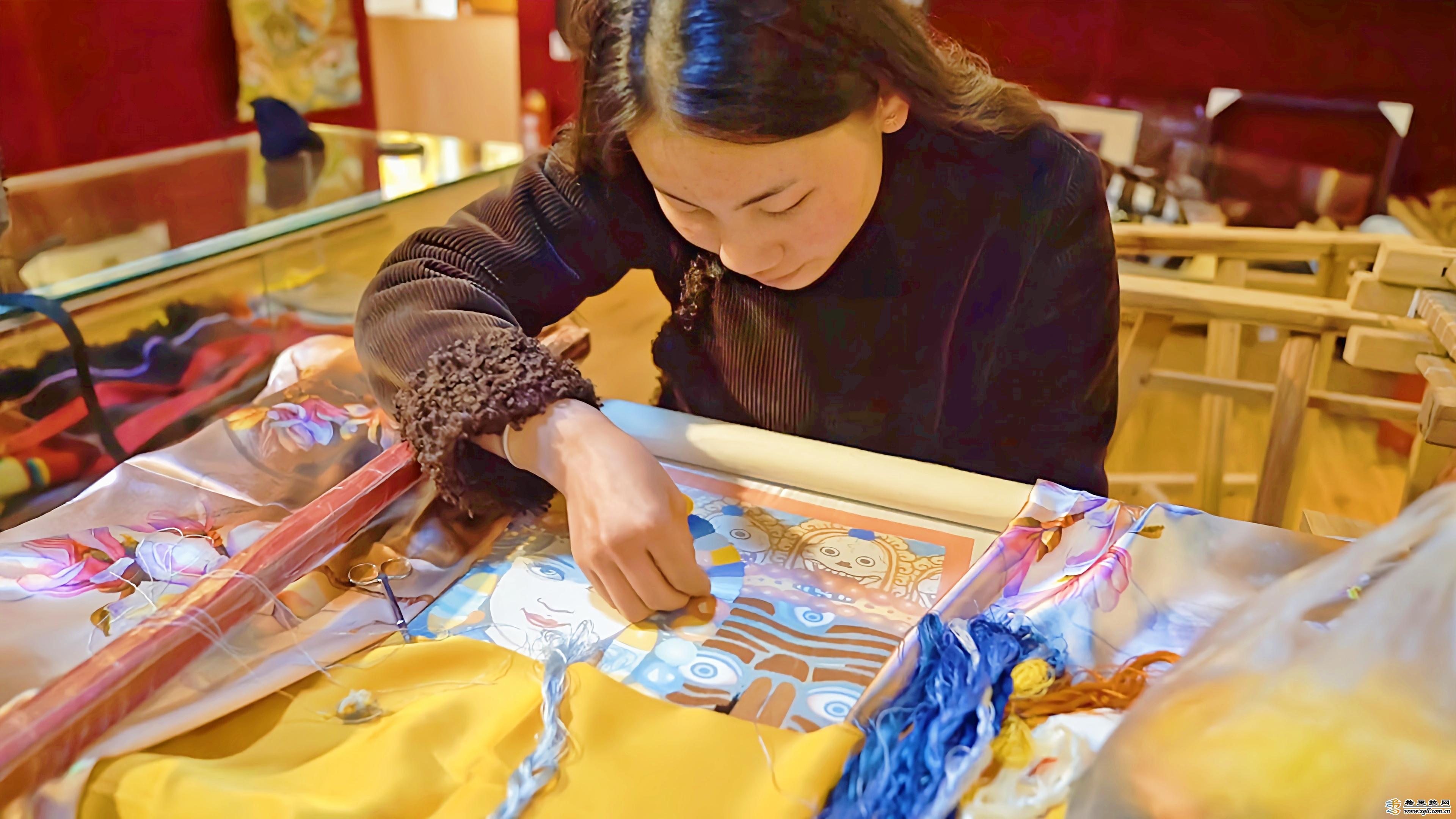 走進(jìn)位于獨(dú)克宗古城的香格里拉藏繡文化藝術(shù)院,一件件精美的手工藏繡作品陳列在展館內(nèi)。堆繡、盤金、打籽針?lè)ㄕ故境霾煌L(fēng)格的藏繡手法,細(xì)韌、明亮而又富有彈性的絲線使得繡品艷麗而有光澤,吸引著南來(lái)北往的游客前來(lái)參觀。