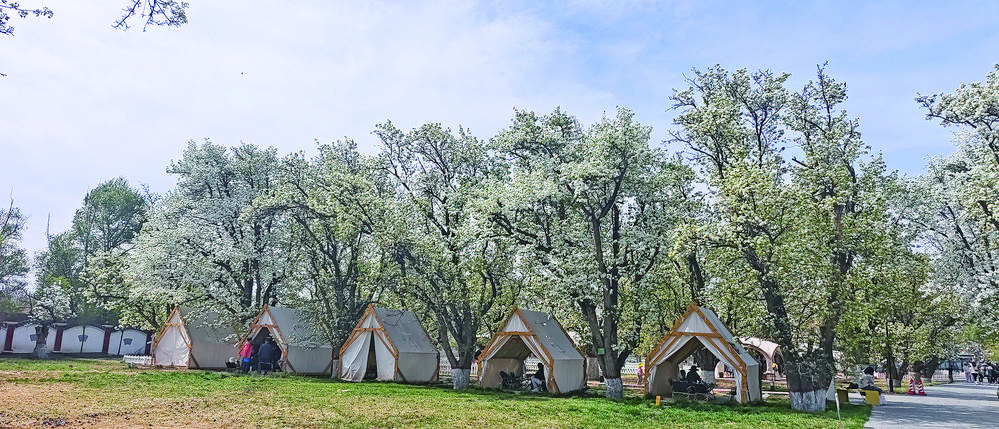 游客在梨樹下打卡拍照。洪玉杰 攝