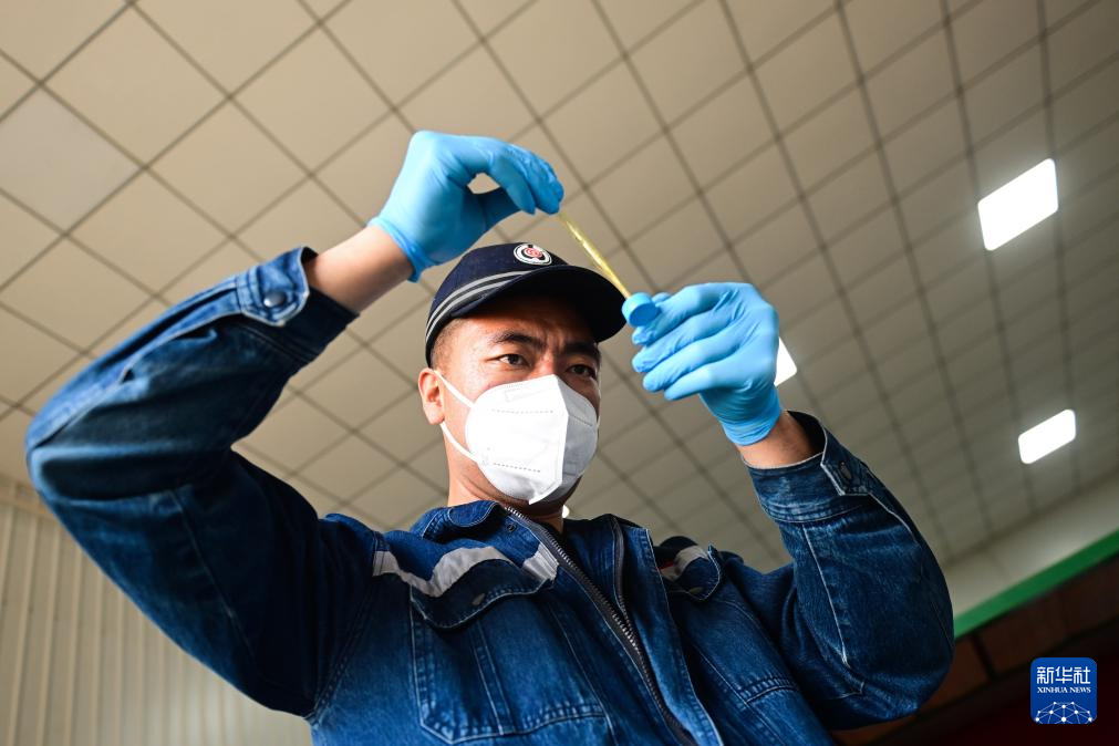 4月25日,中國鐵路青藏集團有限公司西寧工務機械段職工在提取油樣。新華社記者 張龍 攝