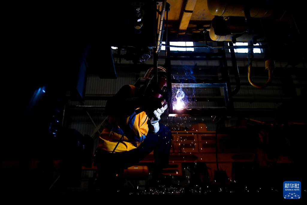 4月25日,中國鐵路青藏集團有限公司西寧工務機械段職工在焊接車梯。新華社記者 張龍 攝