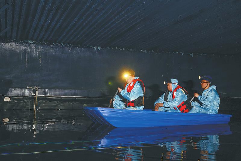 劃著小船進(jìn)入探測(cè)器內(nèi)部,體感溫度逐漸降低,這里的濕度超過90%,水溫接近零攝氏度。通過手電筒射出的光柱,隱約看得見大家呼出的白氣,燈光照射之外的區(qū)域就是極致的黑暗。