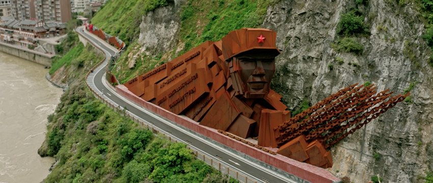 4月20日,大渡橋橫,春和景明。漫步于瀘定縣瀘橋鎮(zhèn)河東片區(qū)的濱河廣場,對岸河西片區(qū)的海子山下,“驚險奇絕”的景觀墻映入眼簾。自南向北遠眺,入目的是巨大的耐候鋼塑紅軍主題雕像群,由主雕“勇士魂”及“飛”“奪”兩組副雕構(gòu)成敘事動線,重溫再現(xiàn)撼人心魄的恢弘歷史。