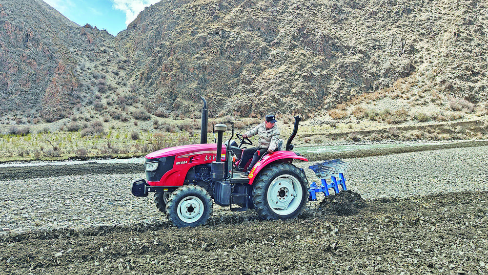 進村時還在飄雪的結拉村,下午放晴了。跟隨駐村工作隊的腳步,我們來到結拉村的春耕現場,三輛拖拉機正在有序犁地,已經犁過的地里,大家在有序地撒種?!叭豪镎f今天開始春耕了,我正好有時間就過來了,我們三四個人輪流開,今天得犁30多畝地?!闭f著話,鬧布達杰的同伴接過了他的車繼續(xù)作業(yè)。“村子里的青壯年基本都會開,誰有時間誰就過來。種地時,大家都不會偷懶,四五天時間,村子里的1500多畝地也就種完了?!濒[布達杰說。