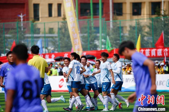 圖為比賽現(xiàn)場,海北祁連山藏羊隊(白衣)慶祝進(jìn)球。馬銘言 攝