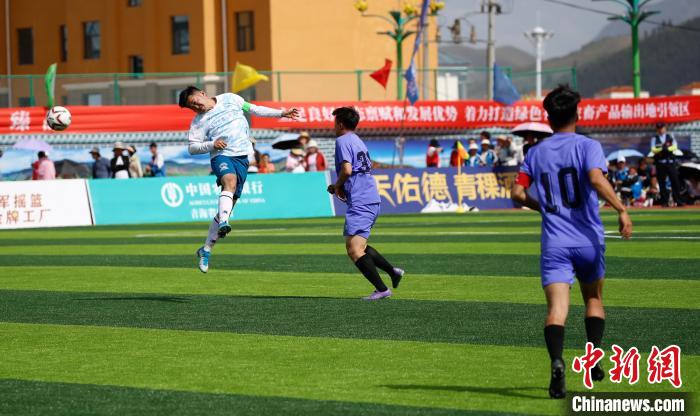 圖為海北祁連山藏羊隊隊員(白衣)在比賽中爭頂頭球。馬銘言 攝