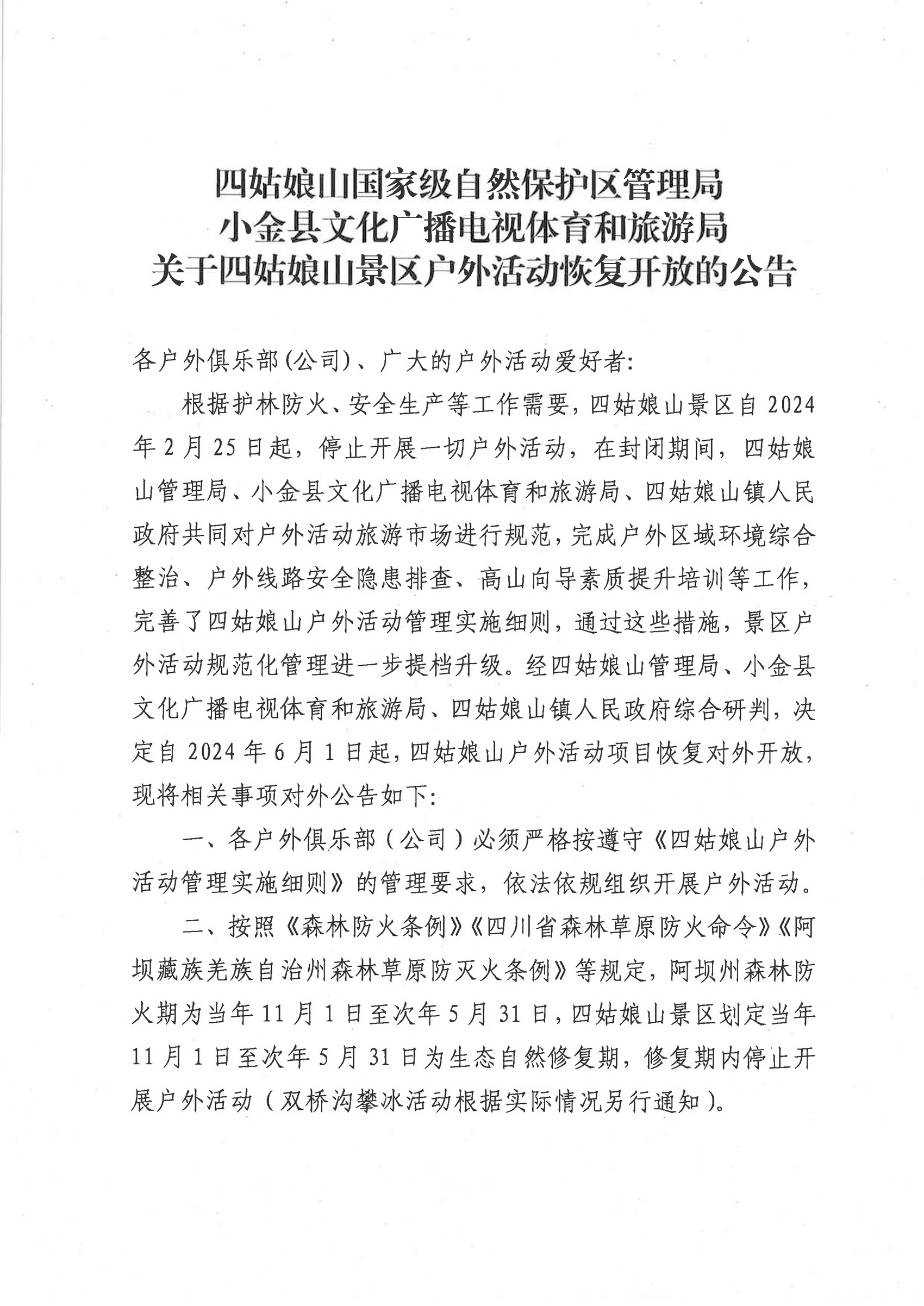 經(jīng)四姑娘山管理局、小金縣文化廣播電視體育和旅游局、四姑娘山鎮(zhèn)人民政府綜合研判,決定自2024年6月1日起,四姑娘山戶(hù)外活動(dòng)項(xiàng)目恢復(fù)對(duì)外開(kāi)放。公告要求各戶(hù)外俱樂(lè)部(公司)必須嚴(yán)格遵守《四姑娘山戶(hù)外活動(dòng)管理實(shí)施細(xì)則》的管理要求,依法依規(guī)組織開(kāi)展戶(hù)外活動(dòng)。