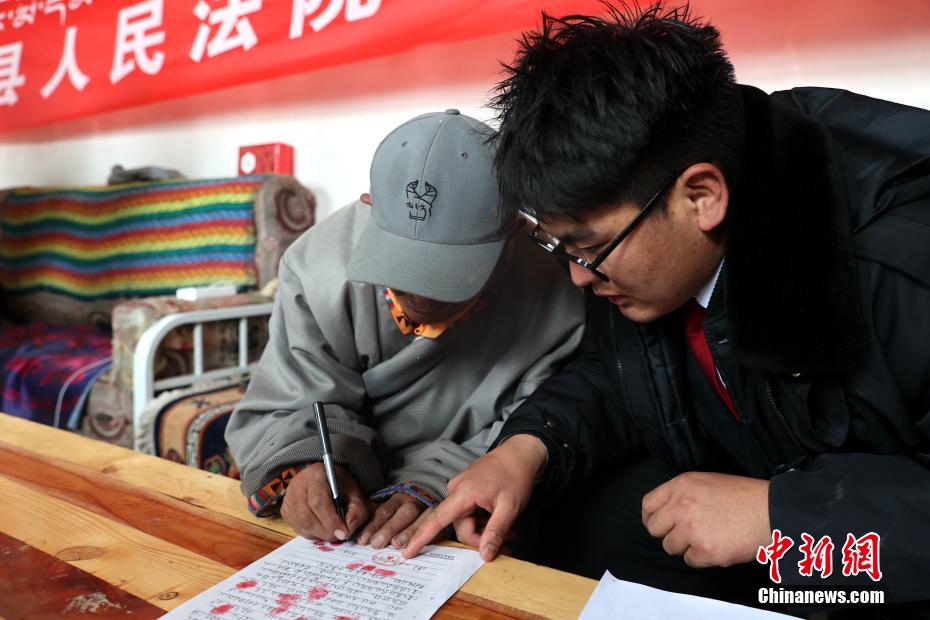 6月3日,在青海省果洛藏族自治州瑪多縣花石峽鎮(zhèn),瑪多縣人民法院“馬背法庭”的法官在牧民家中完成調解并簽字確認。薛蒂 攝
