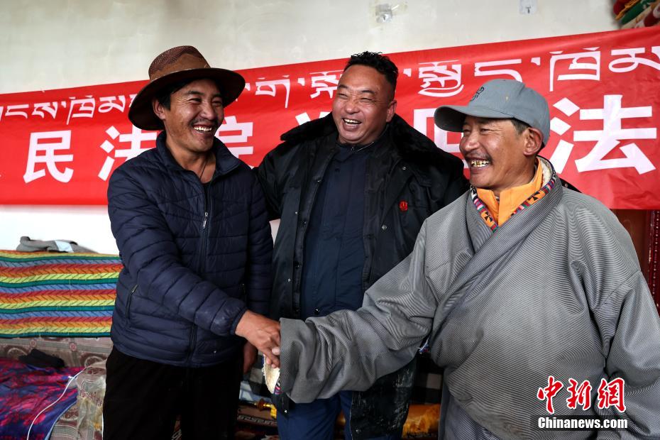 6月3日,在青海省果洛藏族自治州瑪多縣花石峽鎮(zhèn),瑪多縣人民法院“馬背法庭”的法官在牧民家中完成訴前調解。薛蒂 攝