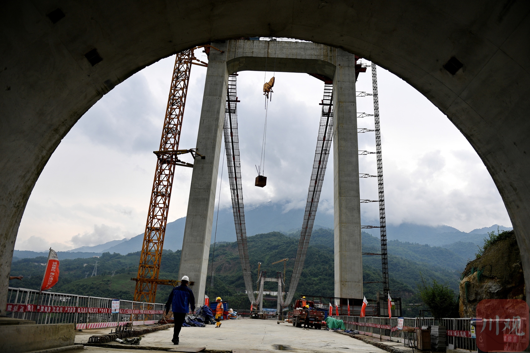 6月18日,阿壩州汶川縣境內(nèi)的國(guó)道317線友誼隧道至映秀段改建工程現(xiàn)場(chǎng),施工人運(yùn)用塔吊吊運(yùn)上部結(jié)構(gòu)施工工具。李向雨 攝