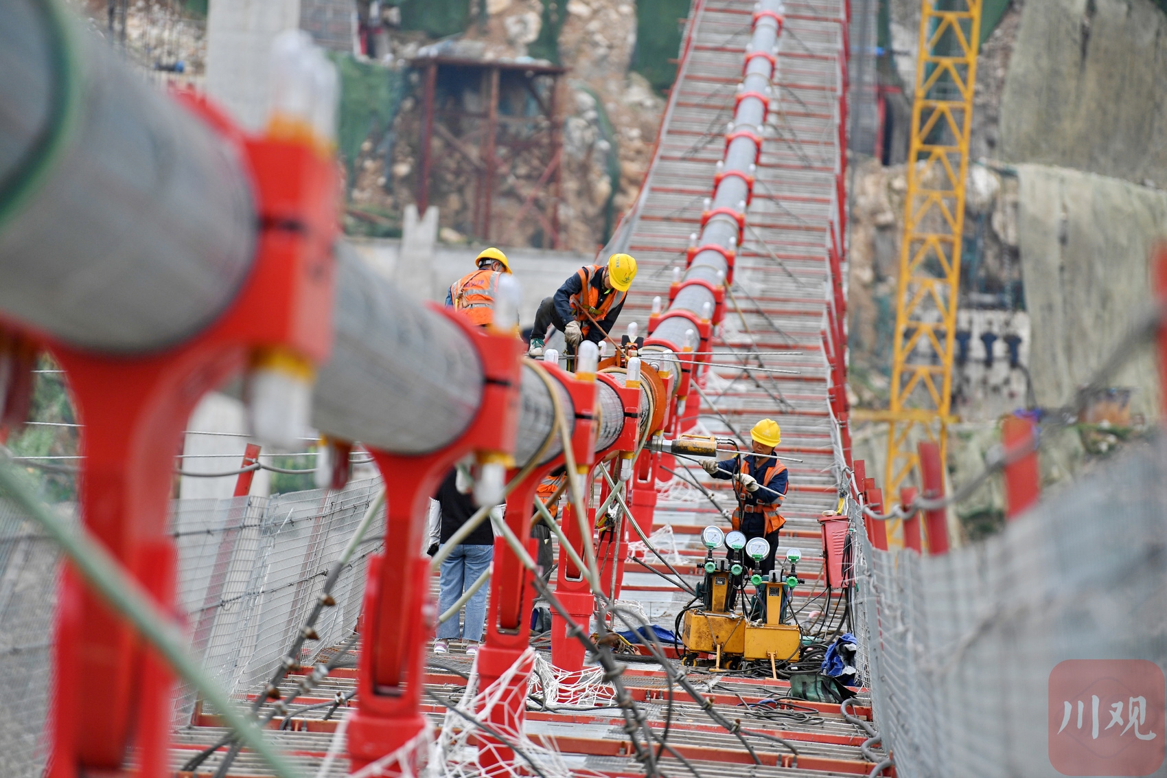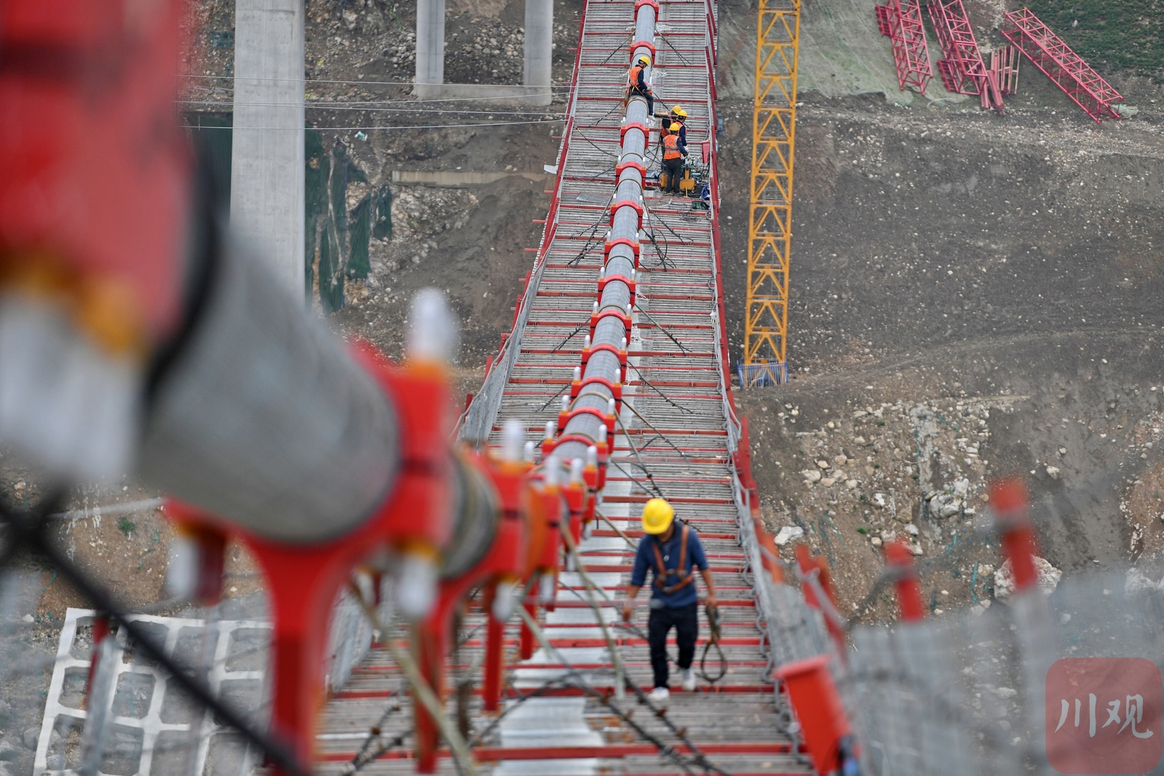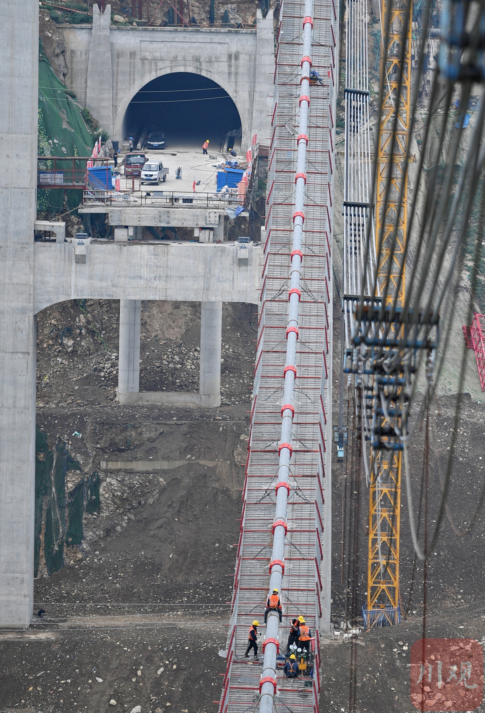 汶川縣境內(nèi)的國(guó)道317線友誼隧道至映秀段改建工程現(xiàn)場(chǎng),施工人員在懸索橋主纜上作業(yè)。李向雨 攝