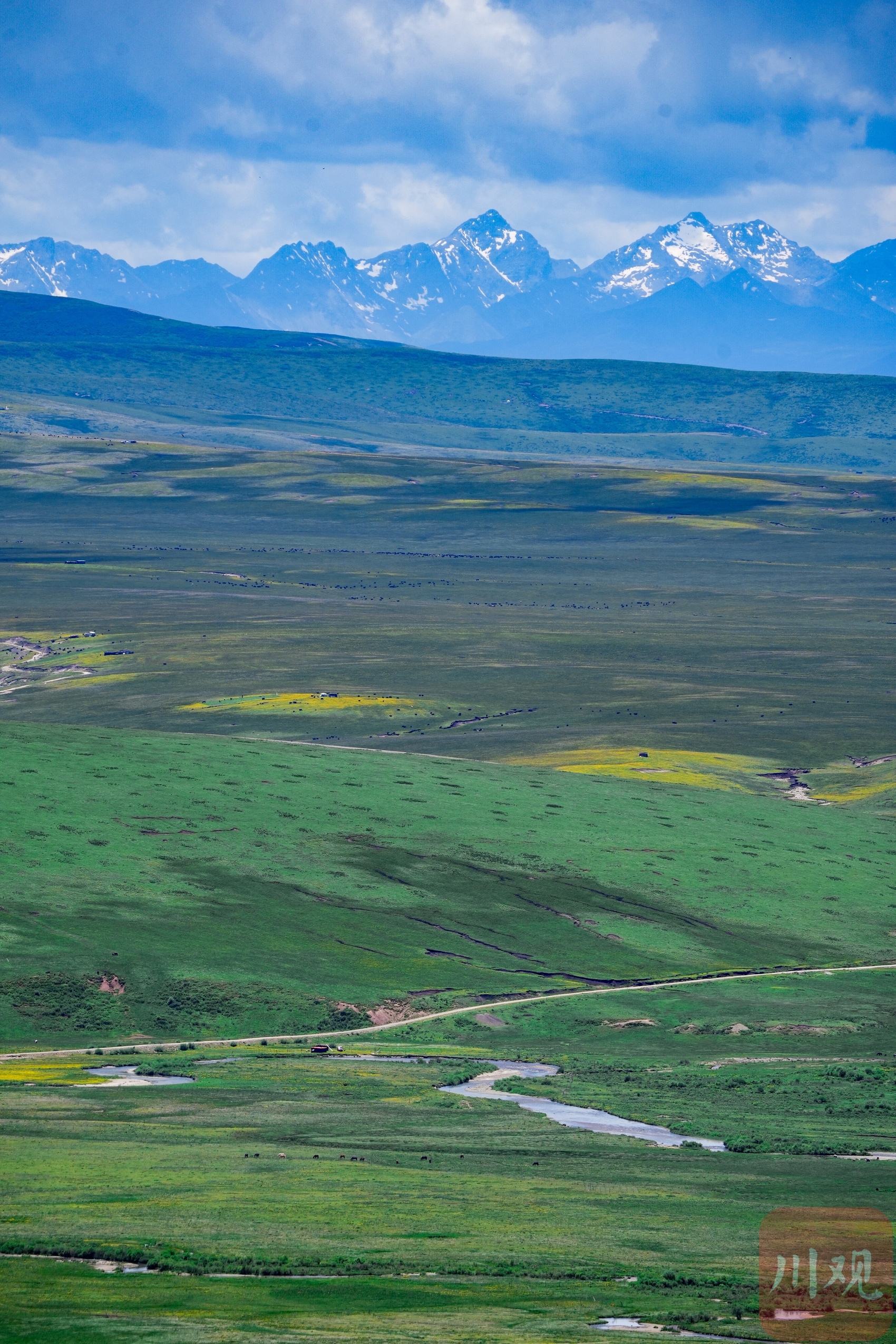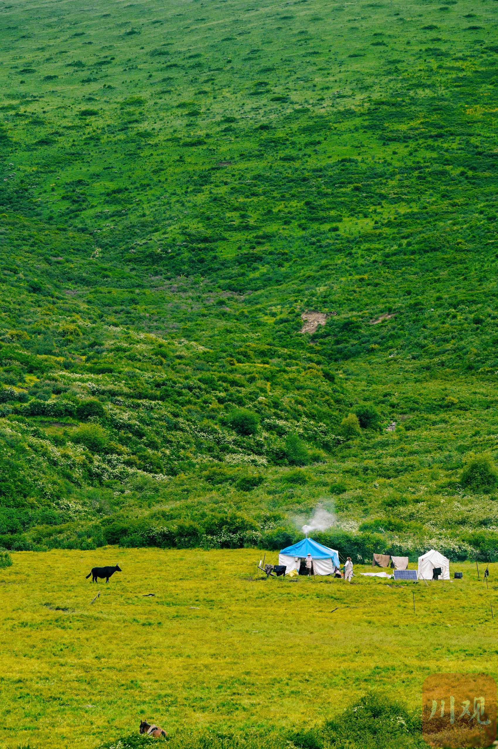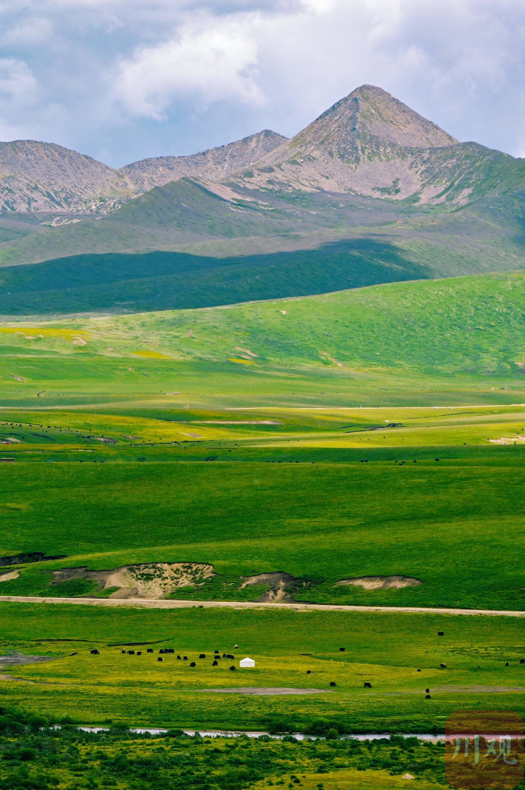 7月2日,四川省阿壩藏族羌族自治州紅原縣龍日鎮(zhèn),行走在路上眼前是不同的風(fēng)景與遇見。悠遠(yuǎn)的天空,潔白的云朵,起伏的山巒,濃綠的草地,閃著微光、涓涓流淌的溪水,連綿的大山…… 藍(lán)天下,滿眼旺盛的綠,這里就是川西高原的“阿勒泰”。