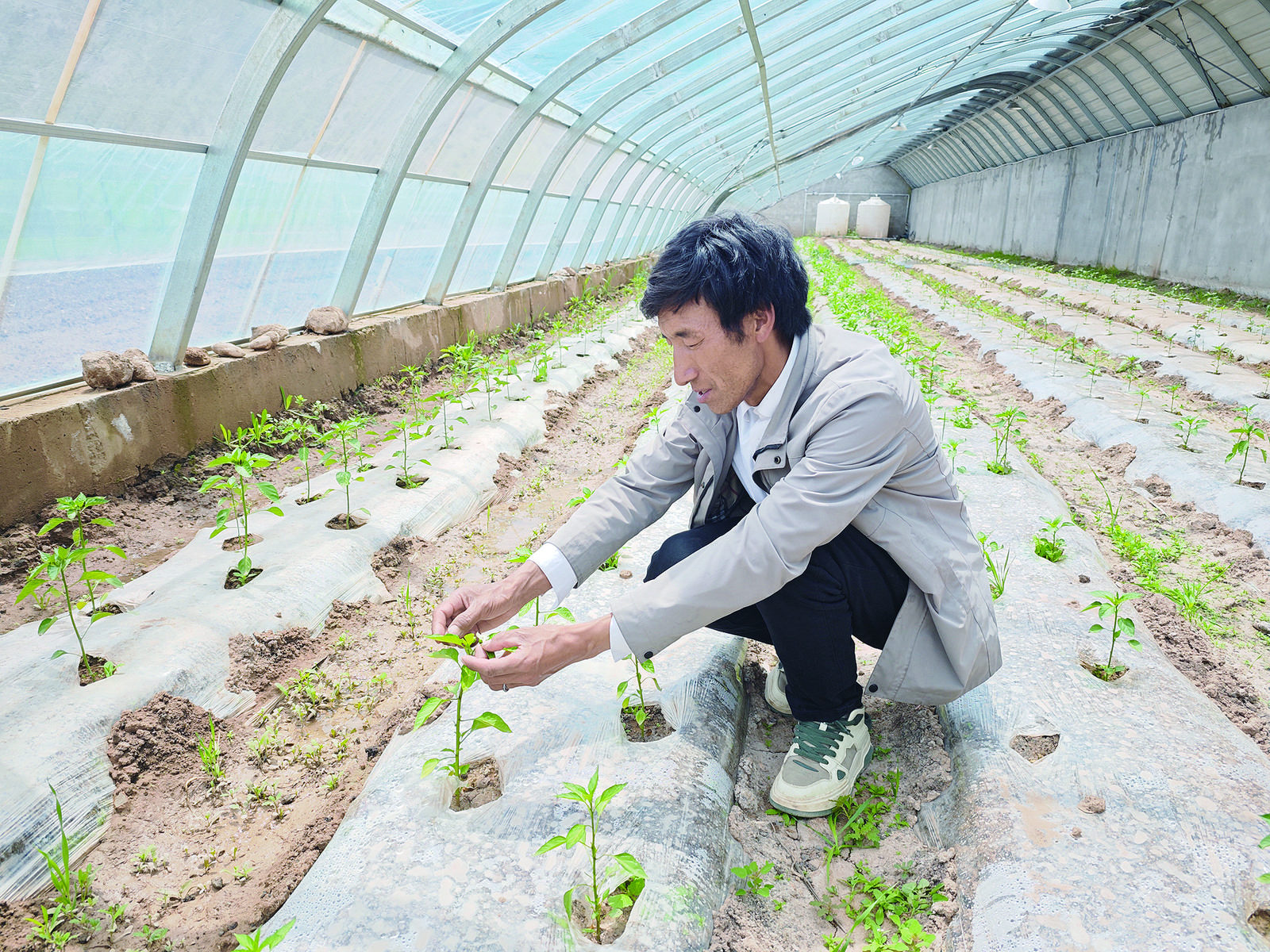 山腳下的一片平地上,一排排溫室大棚整齊排列著,十分顯眼。進(jìn)入溫棚,一股熱浪襲來,青椒、西紅柿、土豆……一片片翠綠的種苗映入眼簾,溫棚的“主人”成林向我們介紹:“這批青椒是六月初種的,差不多到七月底就可以采摘、銷售了,隔壁棚里種的是西紅柿,今年西紅柿的長勢比較好?!?/p>