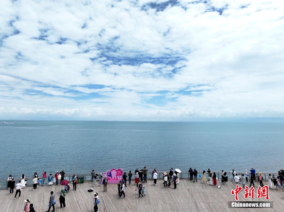 7月8日,航拍游客在青海省海南藏族自治州共和縣青海湖二郎劍景區(qū)內(nèi)觀光。(無人機(jī)照片)中新社記者 馬銘言 攝
