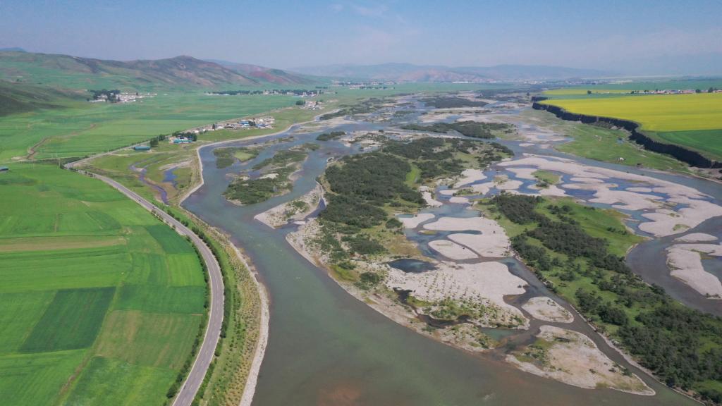 這是2022年6月24日拍攝的祁連山下的大通河(無人機照片)。新華社記者 李占軼 攝