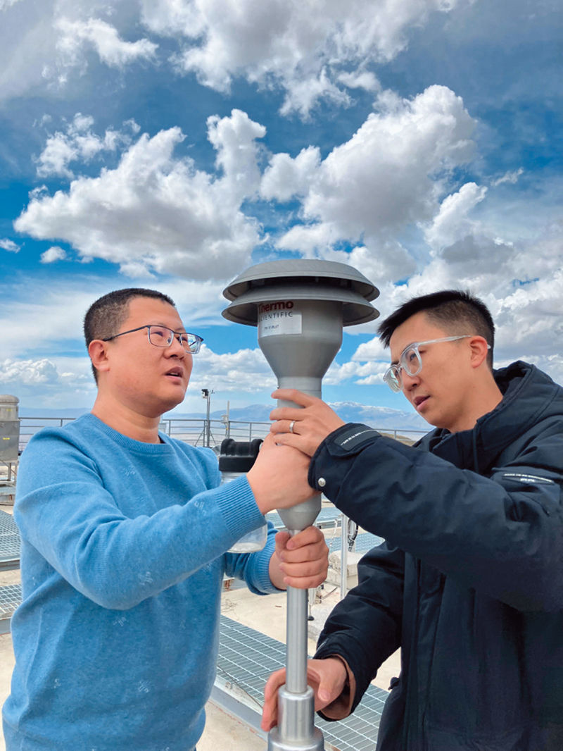 在中國(guó)大氣本底基準(zhǔn)觀象臺(tái)(瓦里關(guān)全球大氣本底站),觀測(cè)業(yè)務(wù)負(fù)責(zé)人王寧章(左)和觀測(cè)員任磊(右)正在進(jìn)行設(shè)備維護(hù)(2024年5月13日攝) 屈辰攝