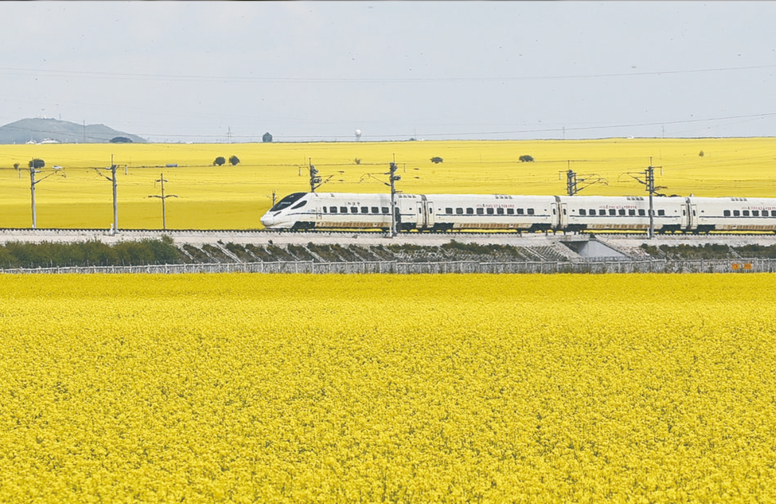 7月18日,一列動(dòng)車(chē)正穿行在青海省海北藏族自治州門(mén)源回族自治縣的百里油菜花海。有“中國(guó)最美油菜花?!敝雷u(yù)的門(mén)源油菜花海已進(jìn)入盛花期,7月也是最美的觀(guān)賞季。(祁國(guó)彪 攝)