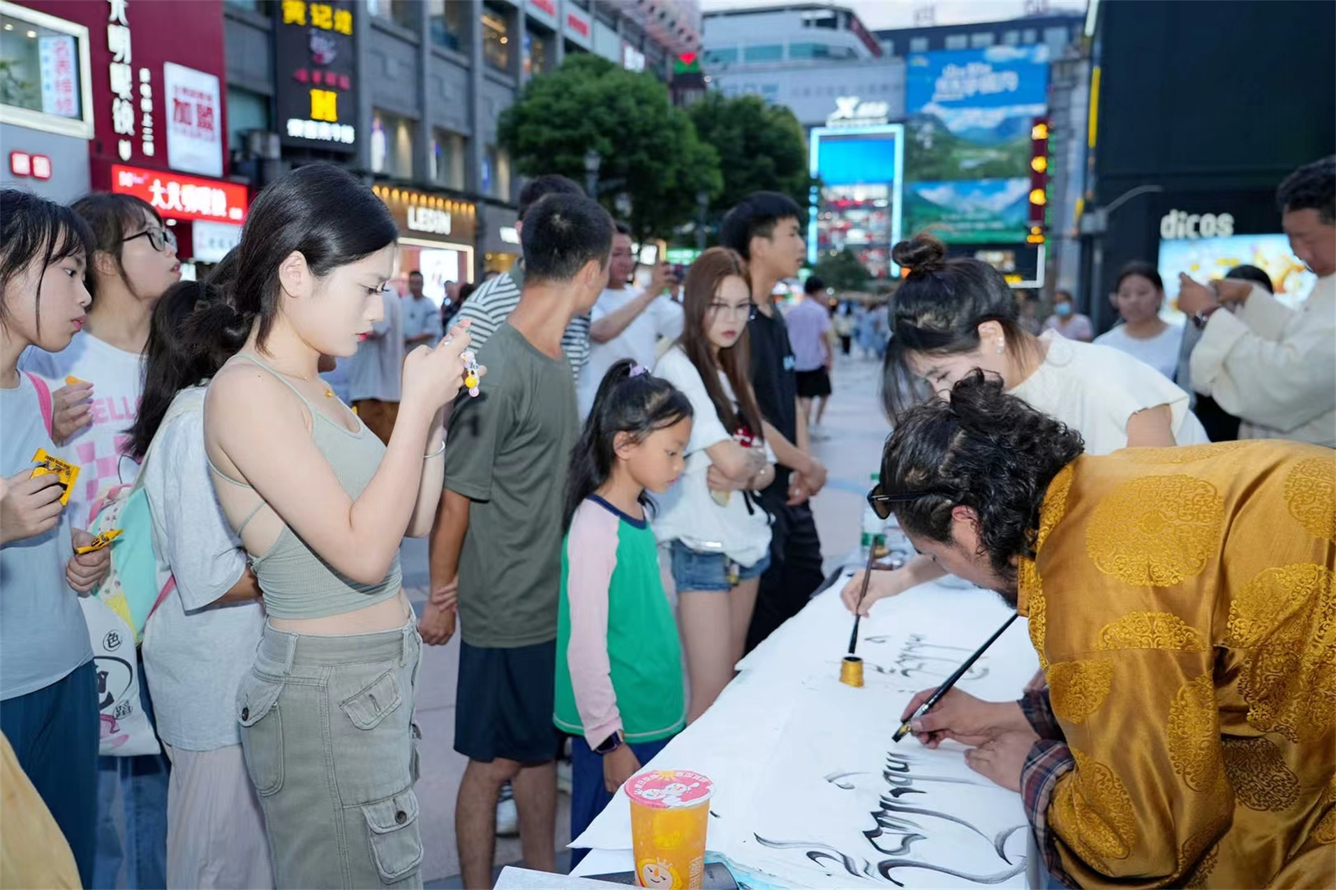 臨近傍晚,在春熙路“丹青繪盛景 筆墨頌祖國”藏文書法展演區(qū),兩位身著藏族傳統(tǒng)服飾的書法老師端坐于案幾之后,他們手持毛筆,蘸取特制的藏墨,在潔白的宣紙上揮灑自如,一筆一劃間流露出濃厚的藏族文化韻味。他們書寫的藏文內(nèi)容多為吉祥如意的祝福語,每一幅作品都蘊含著對美好生活的向往和對遠方來客的誠摯歡迎。