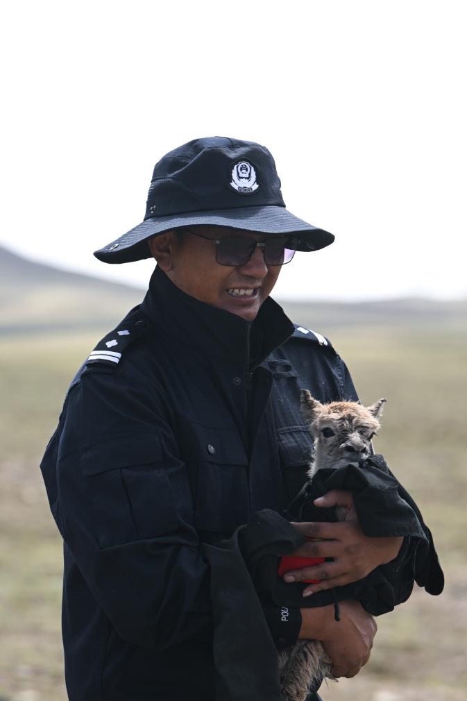 這時(shí),可可西里森林公安局輔警尼瑪扎西接過(guò)了多結(jié)仁欠懷里的小藏羚羊。小藏羚羊渾身濕漉漉的,不停地發(fā)抖。尼瑪扎西隨即脫下自己的衣服,一邊給小藏羚羊擦身體,一邊溫柔地說(shuō):“你的媽媽找不到了,我們來(lái)當(dāng)你的媽媽。”