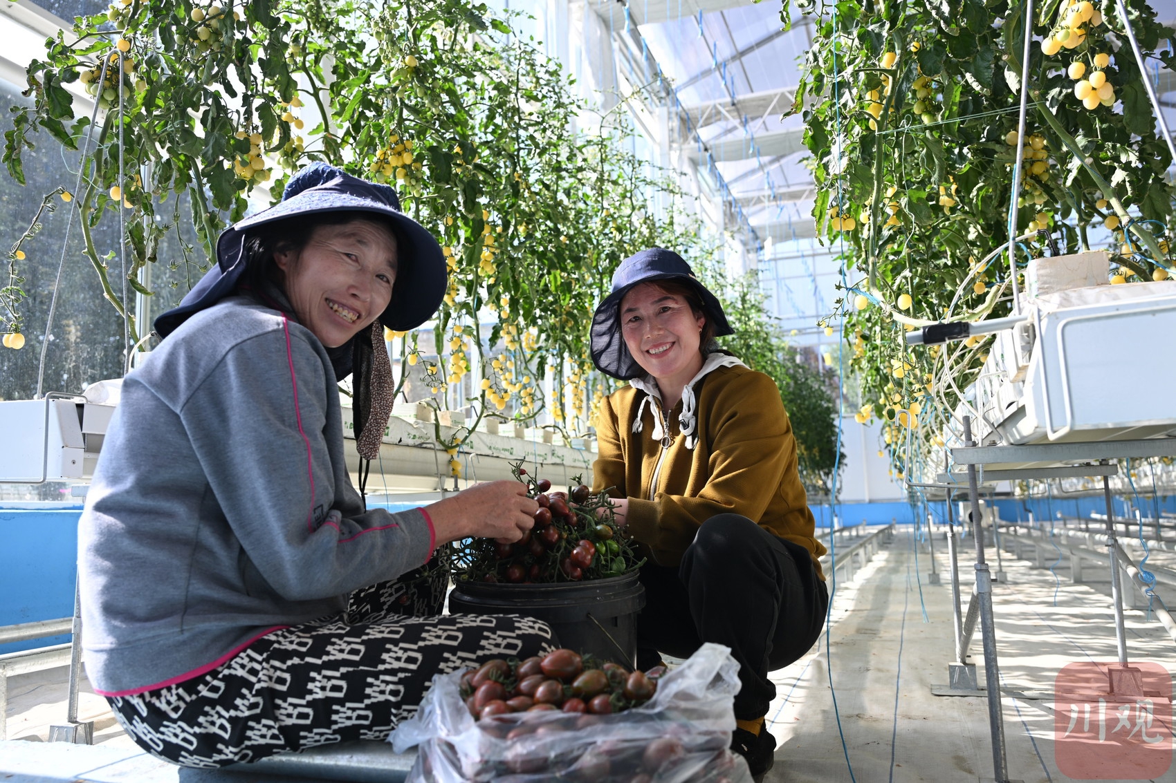 當地農民正在智慧農業(yè)無土栽培館內摘取成熟的作物。
