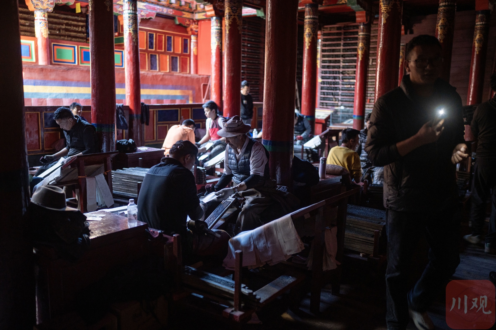 印經(jīng)院工人師傅印制經(jīng)書吸引了游客觀看。