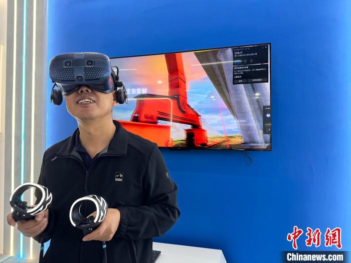 圖為施工人員在施工項(xiàng)目部演示VR安全體驗(yàn)。陳宗淇 攝