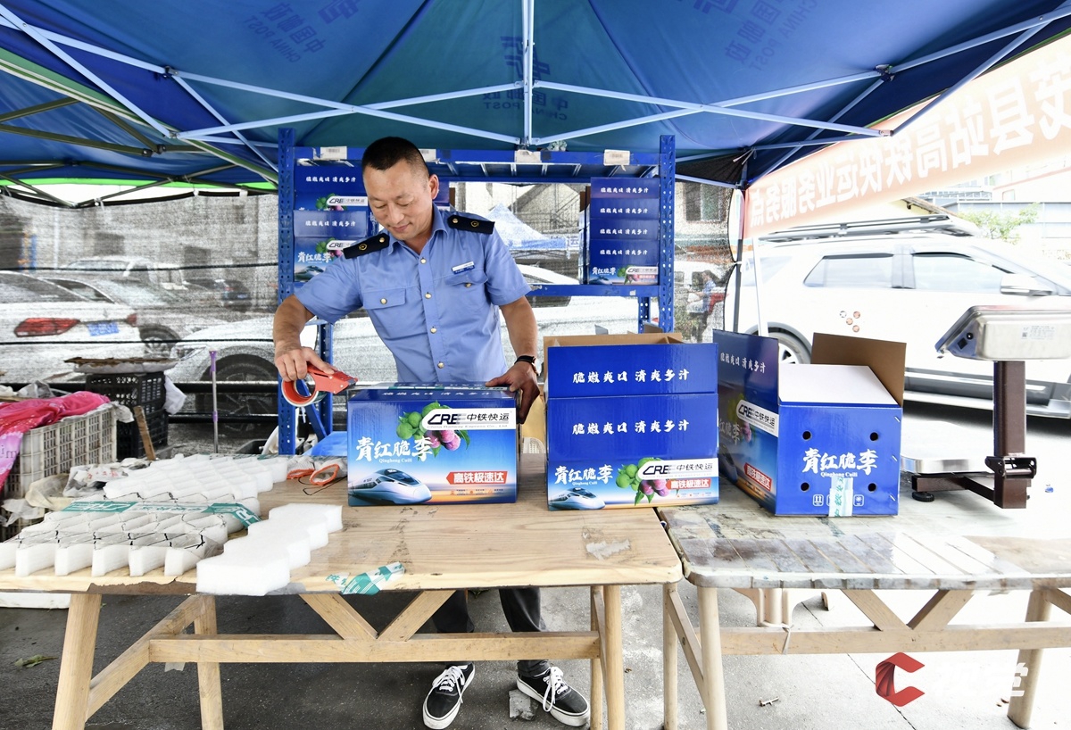 工作人員在高鐵快運(yùn)服務(wù)點(diǎn)打包貨物。