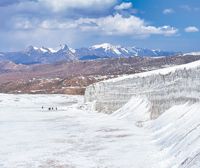 十幾公里的路,汽車走了一個(gè)小時(shí)。越接近冰川腳下,路越是泥濘,雪水拍打著車身。終于,八一冰川到了。一座巨型冰墻橫亙眼前,10多米高的冰柱懸掛在外側(cè)。陽光下,冰化成水,滴滴落下。不遠(yuǎn)處,一條涓涓細(xì)流正往西南方向的山下流去。祁進(jìn)賢說:“這里就是黑河的源頭,是管護(hù)的重中之重。每次來,我都要觀察冰川與上次相比有沒有變化?!?/p>