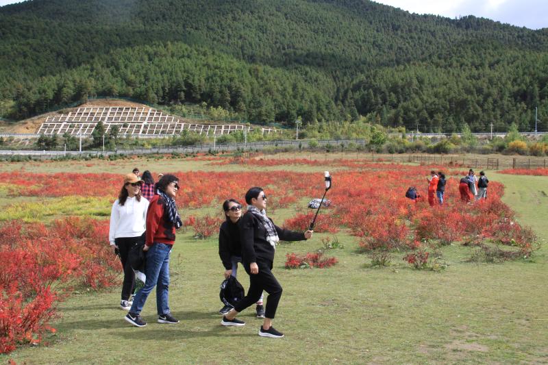 連日來,香格里拉迎來狼毒最佳觀賞期,眾多國(guó)內(nèi)外游客被草原上一片片火紅的狼毒所吸引,紛紛駐足觀賞。圖為游客在香格里拉市小中甸草原賞狼毒、拍照留影。