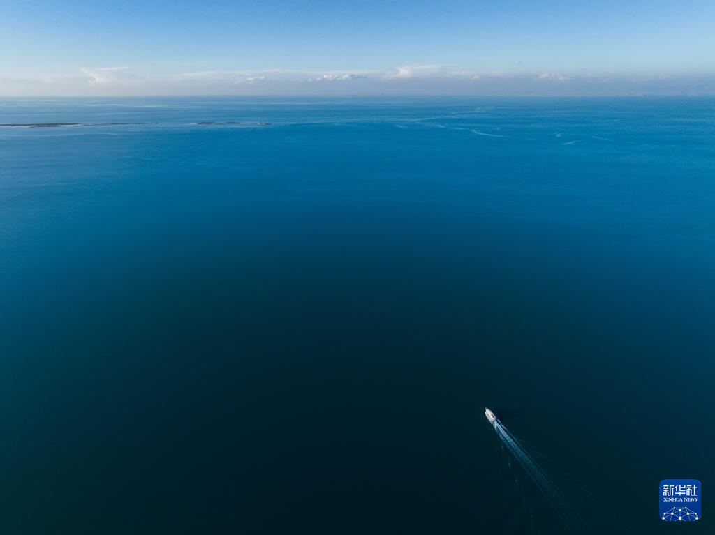 10月18日,一艘游輪行駛在青海湖二郎劍景區(qū)(無人機(jī)照片)。新華社記者 呂帥 攝
