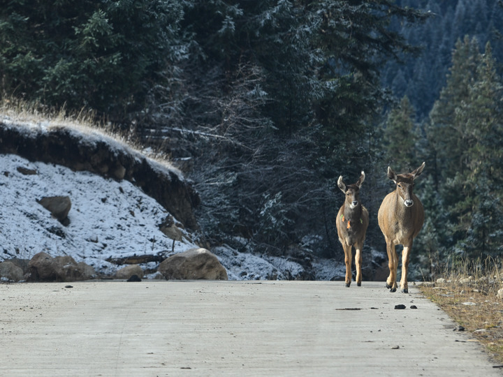 這是11月4日在甘孜藏族自治州德格縣多瀑溝景區(qū)拍攝的2只國(guó)家一級(jí)保護(hù)動(dòng)物白唇鹿。新華社記者 王曦 攝