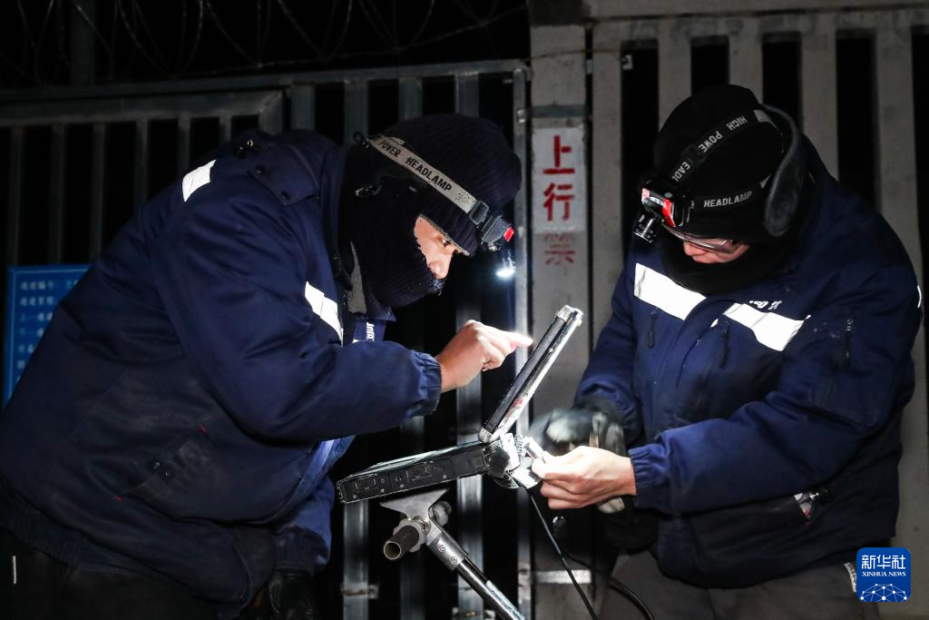 1月14日凌晨,在新烏鞘嶺隧道內(nèi),“90后”線路工工長康川(左)使用鐵路軌道檢查儀檢查線路幾何尺寸。新華社記者 郎兵兵 攝