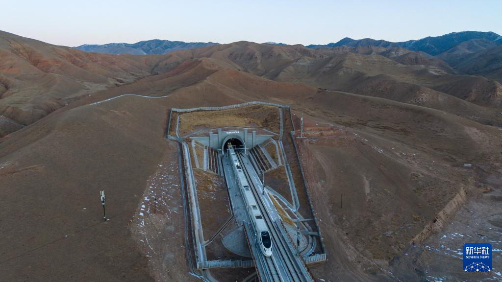 1月14日8時(shí)20分許,蘭州西發(fā)往武威東的D8885次動車組列車穿過新烏鞘嶺隧道(無人機(jī)照片)。新華社記者 郎兵兵 攝