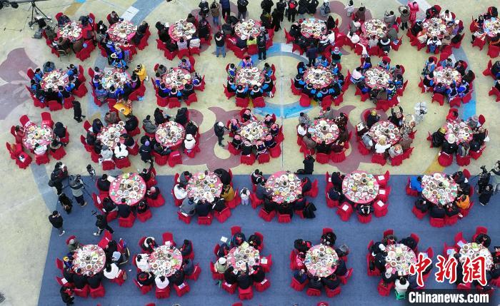 1月25日,四川理縣,阿壩州首屆村晚上的壩壩宴。(無(wú)人機(jī)照片)中新社記者 安源 攝