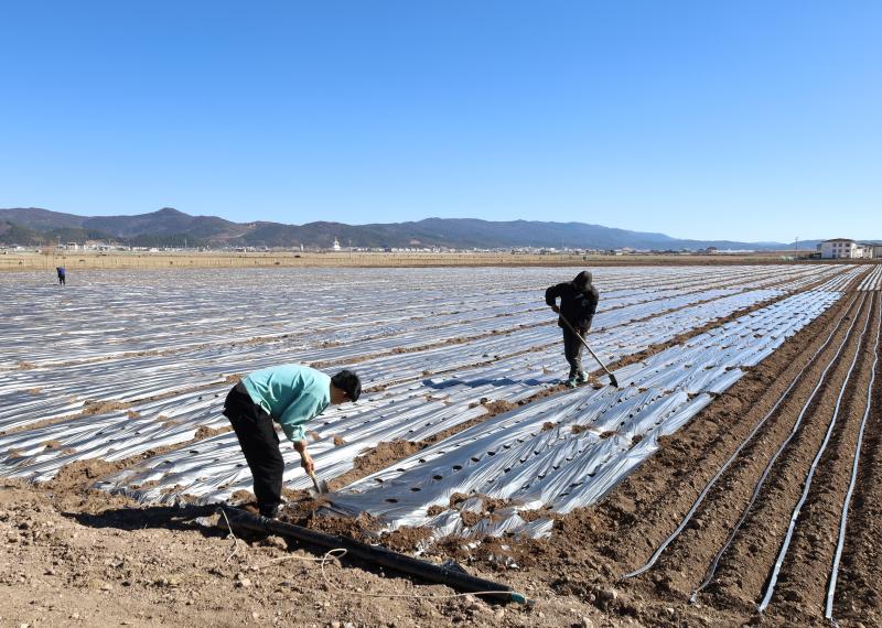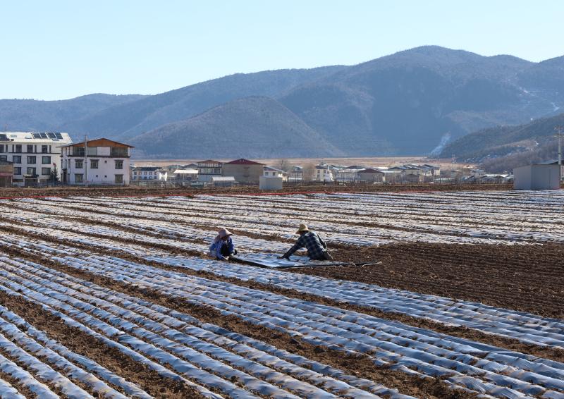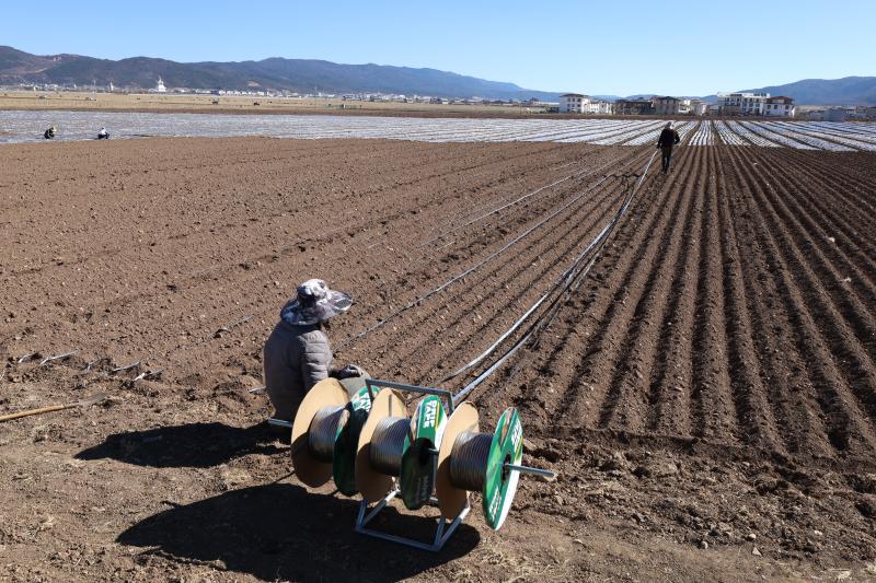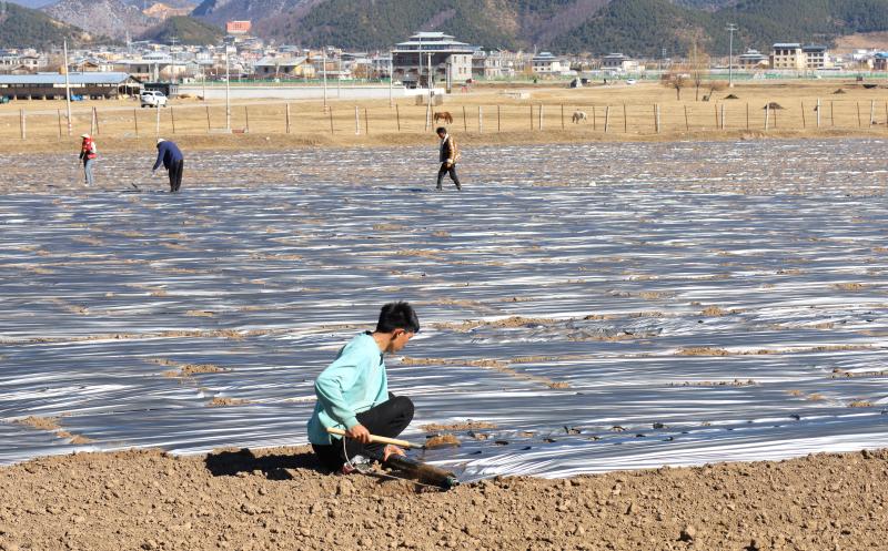 近日,記者在香格里拉市建塘鎮(zhèn)尼史村布倫村民小組看到,工人們正忙著在萵筍基地里鋪設水管、覆膜、培土,為節(jié)后種植萵筍做好準備。