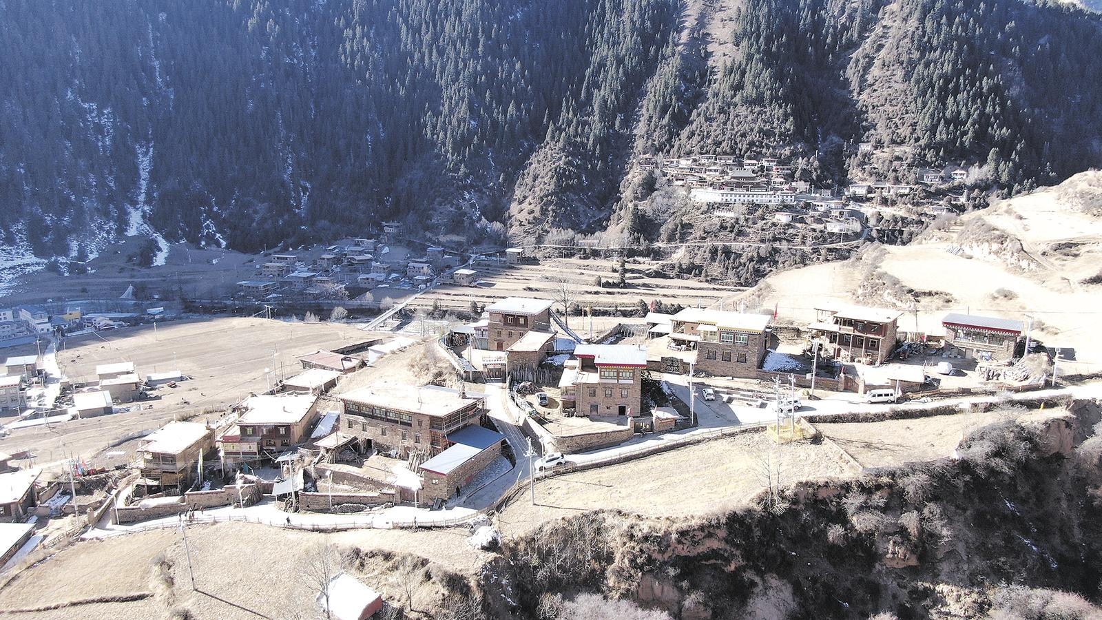 1月13日,記者從班瑪縣出發(fā),沿著蜿蜒的瑪珂河一路南下,來到了“中國保存最完好的藏式碉樓群落之一”的班瑪縣燈塔鄉(xiāng)班前村。走進班前村,只見四面群山環(huán)繞,不遠(yuǎn)處,結(jié)著冰的瑪珂河像一條白絲帶,在陽光的照耀下格外耀眼。依山傍水的班前村地勢起伏較大,行走其間多半為上坡路,不一會兒,記者來到一處相對平坦的房屋前,上面掛著的匾額上赫然寫著“中國傳統(tǒng)村落——班前村”。