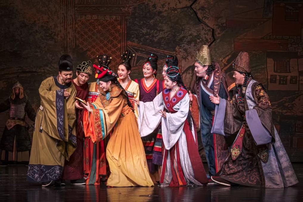 舞臺上,《金城公主》以精湛的表演和細膩的情感刻畫,將一段具有歷史深邃感的唐蕃和盟故事娓娓道來?!拔业闹饕繕耸潜M可能地學(xué)習(xí)民間藏戲,深入了解傳統(tǒng)的演唱風(fēng)格和發(fā)聲方法,為創(chuàng)新表演方式打下基礎(chǔ)?!?1歲的藏戲演員仁青東智在劇中扮演唐中宗,他是西藏大學(xué)聲樂系研究生,在校時學(xué)習(xí)意大利美聲唱法,畢業(yè)后在藏戲中找到了自己的熱愛。