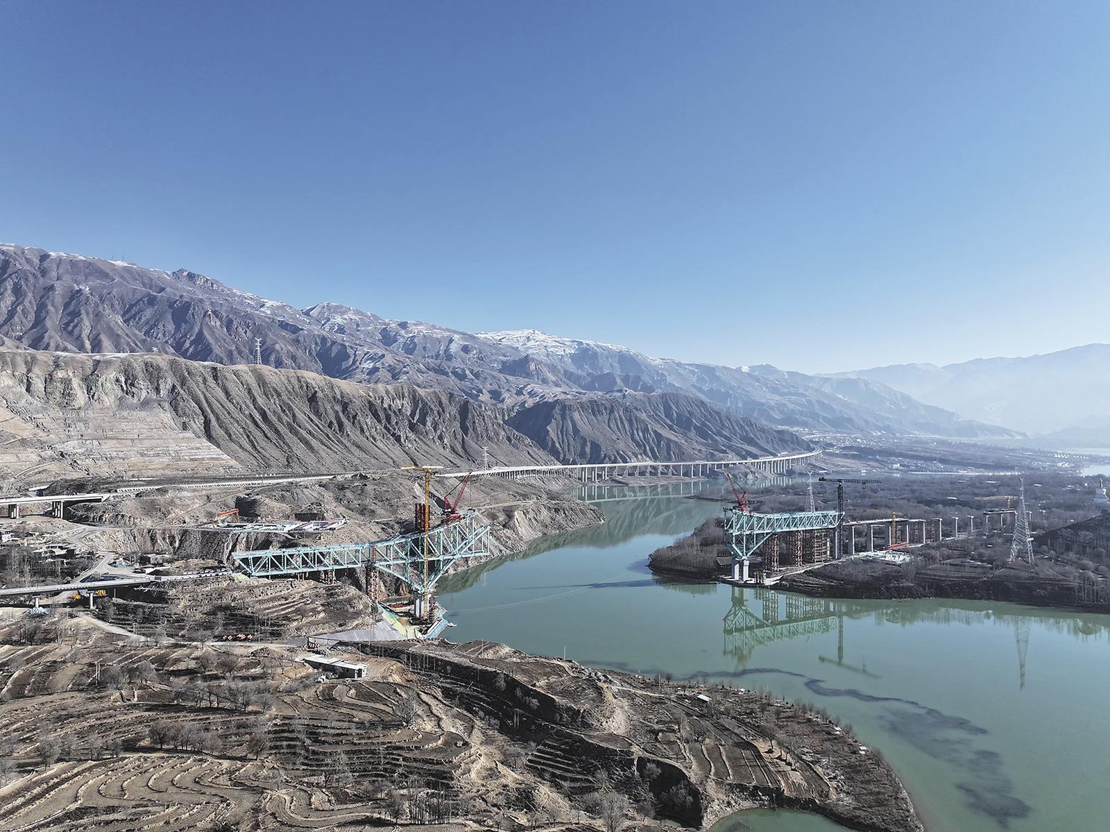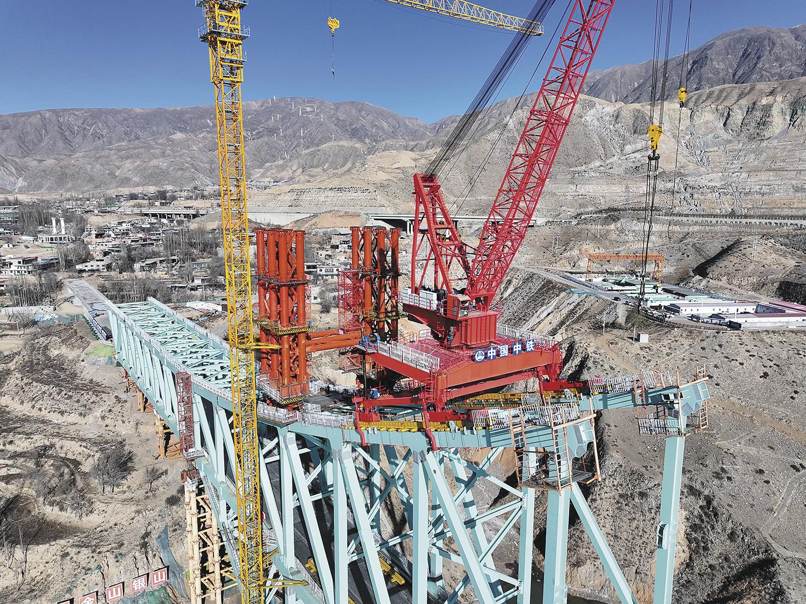“川青鐵路尖扎黃河特大橋主橋鋼桁拱架設進度過半?!笨粗@一片熱火朝天、有序建設的場景,川青鐵路11標中鐵大橋局項目黨支部書記瞿小荃滿懷信心地介紹起項目進度,“黃河北岸已經(jīng)完成第14節(jié)間架設,南岸完成第12節(jié)間架設,主橋需要完成50個節(jié)間,目前共完成26個節(jié)間架設?!?/p>
