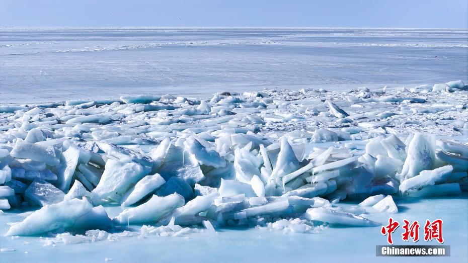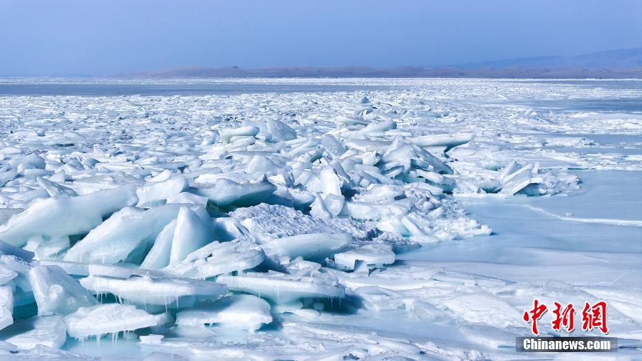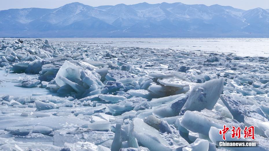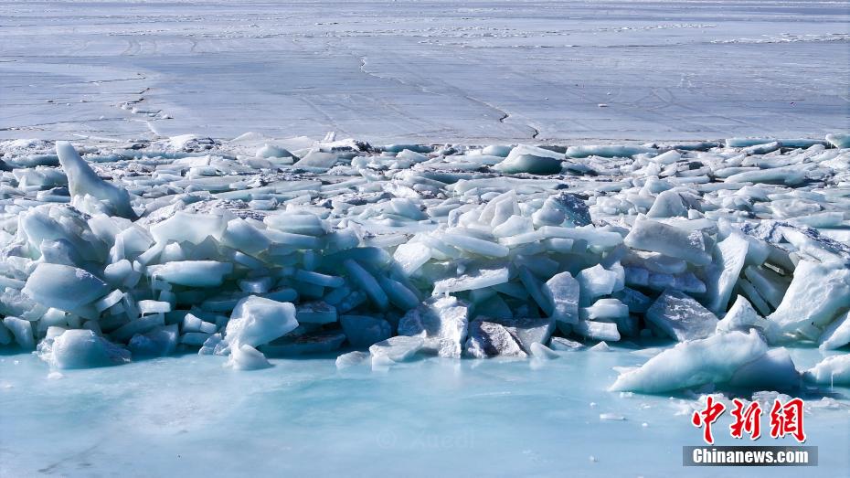 2月13日,青海省海南藏族自治州青海湖南岸,堆積在岸邊的冰塊在光線照射下呈藍冰景象,與周邊雪山、藍天、沙漠等大自然景色巧妙融合,吸引游客和攝影愛好者前來觀賞。