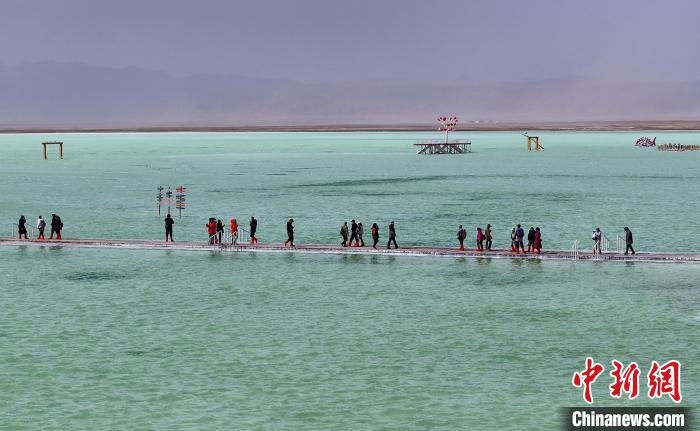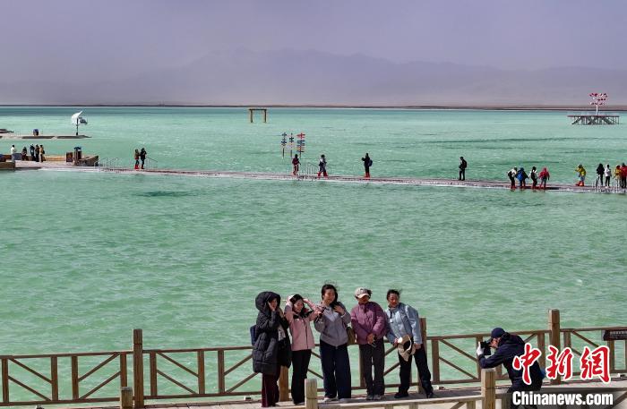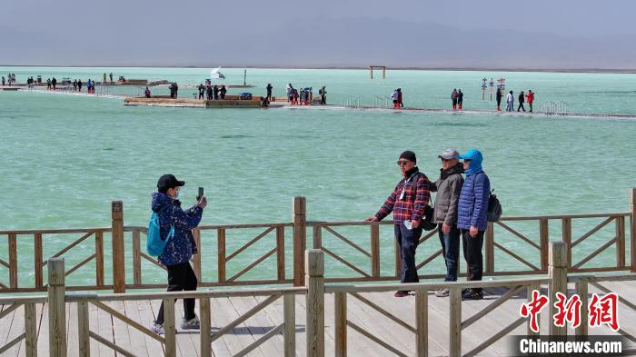 3月26日,游客在茶卡鹽湖景區(qū)合影。中新社記者 馬銘言 攝
