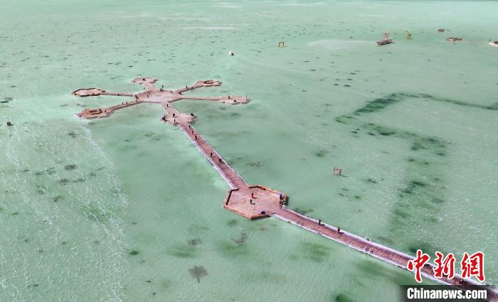 3月26日,游客在茶卡鹽湖景區(qū)合影。(無人機照片)中新社記者 馬銘言 攝